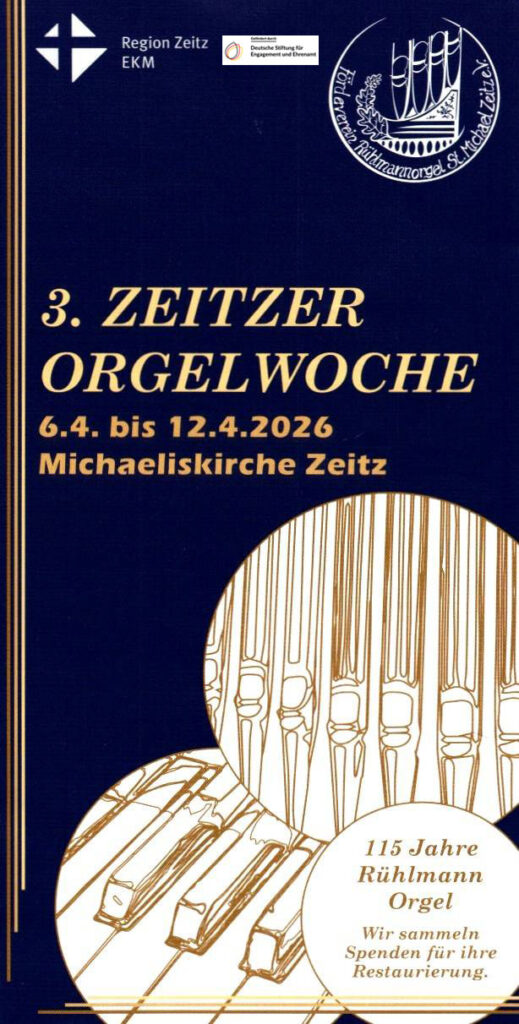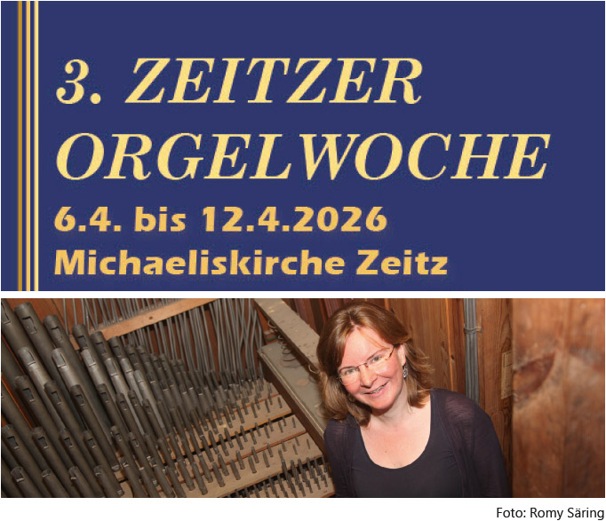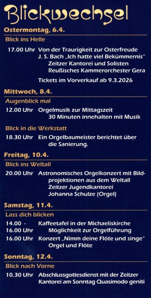 Seit 1911 klingt die Rühlmannorgel in unserer Michaeliskirche, inzwischen also im 115. Jahr. Zu diesem Anlass lädt der Orgelverein Rühlmannorgel im April zur 3. Zeitzer Orgelwoche ein. Unter der Überschrift „Blickwechsel“ öffnet die Orgel in der Osterwoche, vom 6. bis zum 12. April, neue Perspektiven: als Instrument des Trostes, des Handwerks, des Staunens und des Aufbruchs. Der Auftakt der Orgelwoche steht im Zeichen des österlichen Aufblickens. Die Musik von Johann Sebastian Bach folgt dem Weg aus Bekümmernis und Dunkelheit hin zu Hoffnung und Licht. Ostern erscheint hier nicht als fertiger Jubel, sondern als Verwandlung – ein erster Blick ins Helle.Wie entsteht Orgelklang? Was verbirgt sich hinter den Pfeifen? Ein Blick hinter die Kulissen eröffnet Einblicke in das Handwerk, die Technik und die klangliche Gestaltung der Orgel. Ein Abend des Hörens, Fragens und Verstehens.Am Freitag trifft die Orgel auf das Universum. Zu Orgelmusik werden Bilder aus dem Weltall projiziert – Sterne, Galaxien und ferne Räume. Klang und Kosmos treten in einen Dialog, der staunen lässt und die Perspektive weit öffnet.Die Veranstaltungen der Orgelwoche verbinden Musik, Raum und Wahrnehmung – und laden dazu ein, den eigenen Blick neu auszurichten.